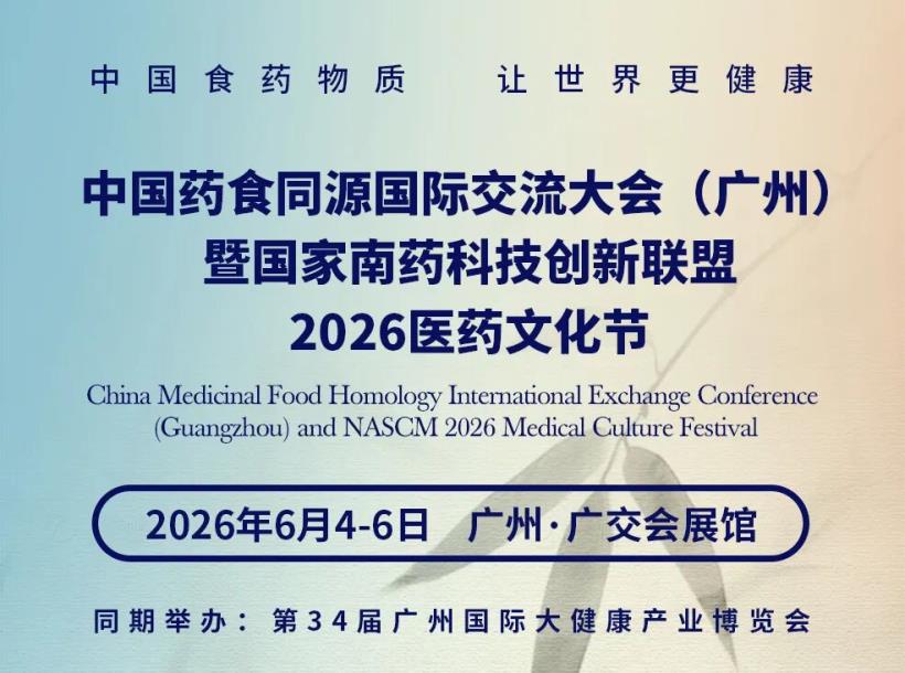 为进一步推动中医药传承创新发展,构建药食同源(食药物质)领域实体化、网络化、高效运行的产学研协同创新体系,建立集政策解读、学术交流、科技转化、产业合作、国际对接于一体的权威平台,“中国药食同源国际交流大会(广州)暨国家南药科技创新联盟2026医药文化节”将于2026年6月4-6日在广州·广交会展馆举办。