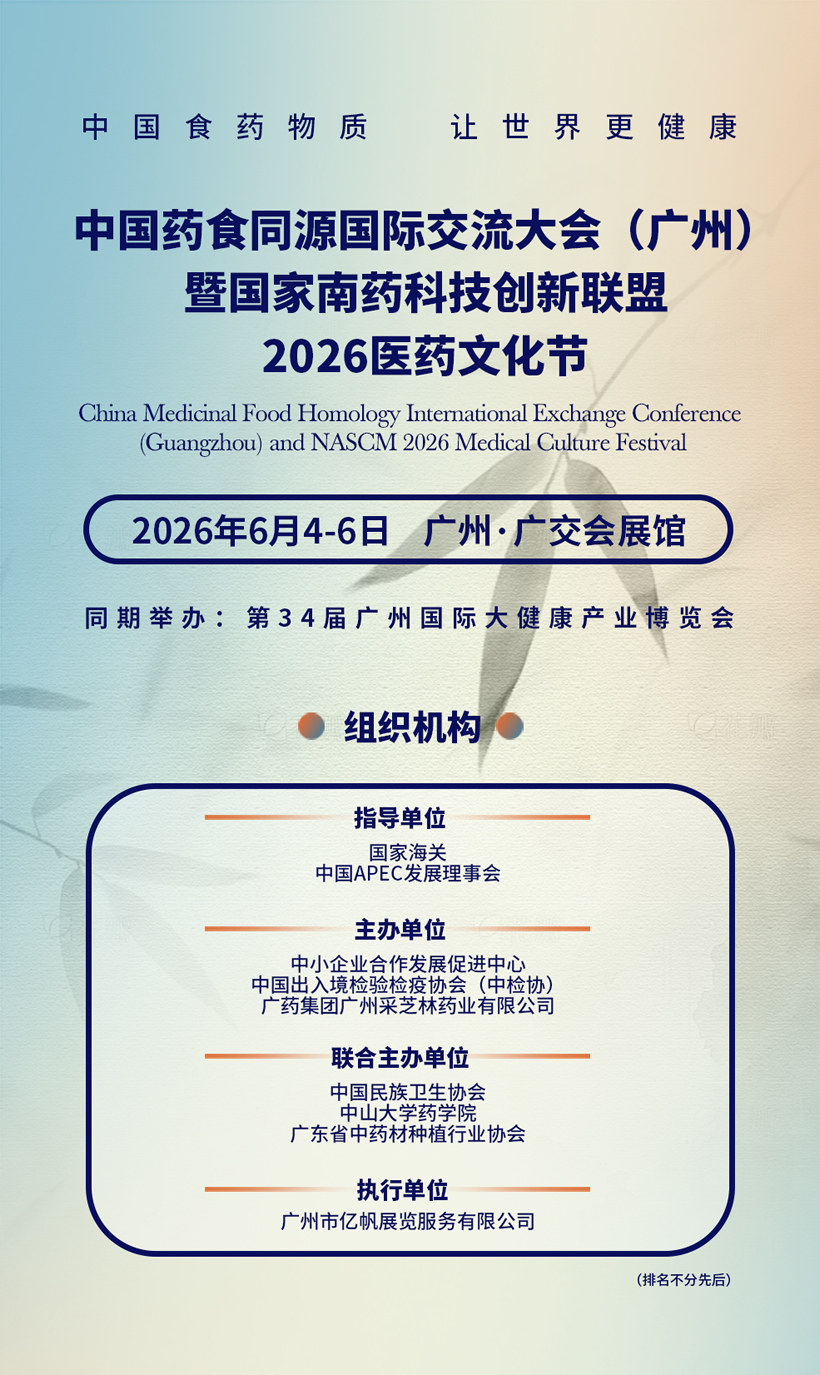 2026年6月4-6日,中国药食同源国际交流大会(广州)暨国家南药科技创新联盟2026医药文化节将在广州·广交会展馆举办。