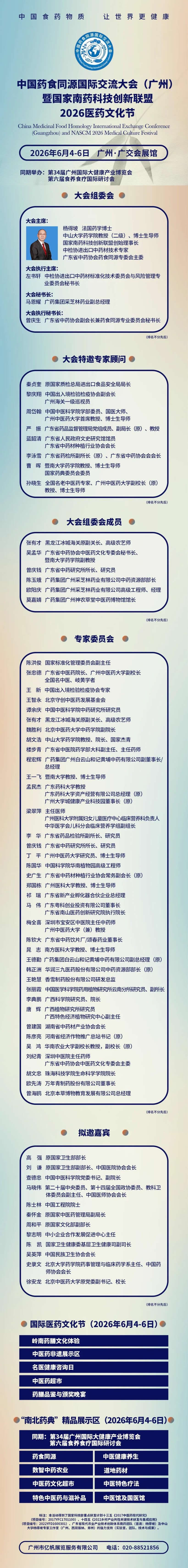 为进一步推动中医药传承创新发展,构建药食同源(食药物质)领域实体化、网络化、高效运行的产学研协同创新体系,建立集政策解读、学术交流、科技转化、产业合作、国际对接于一体的权威平台,“中国药食同源国际交流大会(广州)暨国家南药科技创新联盟2026医药文化节”将于2026年6月4-6日在广州·广交会展馆举办。