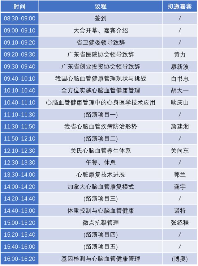 首届广东心脑血管健康管理大会 2018年6月28-30日,一场心脑血管学界的重磅盛会即将在广州拉开帷幕。 由广东省医院协会、广东省创业投资协会联合主办的“首届广东心脑血管健康管理大会”,将广邀中国健康促进基金会理事长白书忠、同济大学医学院院长胡大一、广东省人民医院原院长罗征祥、意大利心血管研究学会会长格尔马诺·迪夏希奥教授等心脑血管健康管理领域的顶级大咖,深度探讨心脑血管预防、保健、诊疗、康复、管理的技术、产品、项目、机构等话题。 同时,大会将邀请广东省人民医院、中山一院、南方医院、和凤医疗集团、联合医生集团、博德嘉联医生集团、红杉资本、IDG资本、广东创投会等过百家医院、医生集团、投资机构参会,以期共襄盛举! 心脑血管数据了解一下 1. 心脑血管疾病具有“发病率高、致残率高、死亡率高、复发率高,并发症多” ——“四高一多”的特点 2. 全世界每年死于心脑血管疾病的人数高达1500万人,居各种死因首位 3. 据国民营养与慢性病状况调查报告,中国18岁以上居民高血压患病率为25.2% 4. 2017年6月,《中国心血管病报告2016》发布,我国心脑血管疾病患者已经超过2.9亿人 5. 我国每年死于心脑血管疾病近300万人,占我国每年总死亡病因的51%。而幸存下来的患75%不同程度丧失劳动能力,40%重残。特别是农村,近几年来心血管病死亡率持续高于城市水平。 01 组织机构 主办单位 广东省医院协会 广东省创业投资协会 拟协办单位 中国健康促进基金会 广东省疾控中心 广东省医师协会 广东省健康管理协会 广东省保健协会 承办单位 广东省医院协会健康管理专业委员会 广东省创业投资协会大健康投融资俱乐部 广东万木春医疗科技有限公司 广州英富曼意帆展览有限责任公司 02 拟邀嘉宾 (请上下滑动查看下图内容) 03 大会议程 首届广东心脑血管健康管理大会 2018年6月28日 09:00-16:20 (以上议程如有变动,请以现场为准) 2018年广东省医院协会健康 管理专业委员会年会 暨第四届广东省健康管理高峰论坛 2018年6月30日 09:00-12:30 (以上议程如有变动,请以现场为准) 04 拟邀单位、机构 拟邀参展医院 广东省人民医院 中山一院 南方医院 中山二院 广医附二院 深圳孙逸仙纪念医院 三九脑科医院 廉江市人民医院 海南省农垦总医院 紫金县人民医院 广东省第二中医院 佛山市第一人民医院 广东省第二人民医院 肇庆市第一人民医院 高州市人民医院 珠海市人民医院 汕头医大附属第一医院 深圳市人民医院 中山小榄人民医院 东莞市人民医院 拟邀医生集团 和凤医疗集团——家庭医生在线名医诊疗中心 华医心诚心血管专科医生集团 博德嘉联医生集团 联合医生集团 胡大一医生集团 心纪元心血管医生集团 美奥名医汇 卓正医疗集团 弘康大医汇共享医生平台 广东民航心脑健康管理医生集团 瑞士医疗领誉集团 拟邀投资机构 红杉资本 广东创投会资产管理股份有限公司 IDG资本 广东中大科技创业投资管理有限公司 中科招商 广东北大潮建资产管理有限公司 中信证券 易方达基金管理有限公司 广州基金 广州安融达创企业咨询有限公司 国美金融 吉富创业投资股份有限公司 广东医谷 广发信德投资管理有限公司 大一资本 阳和生物医药产业投资有限公司 达晨创业投资有限公司 广发纳斯特投资管理有限公司 广州尚东创投有限公司 同期展会 “第27届国际大健康产业博览会”将于2018年6月28-30日在广交会展馆隆重举办,展品囊括特殊食品、保健食品、滋补品、美容排毒养颜、医疗保健器械、健康管理服务、中医药大健康、生物技术、生殖健康产品、健康养老产业、大健康店院馆配套设施等。2018年展会将比上届有更大的突破:与IFE China大食品展、SupplySide健康创新原料展同期举办,规模预计将达8万平方米,超过2000家知名企业参展。 预登记现已正式开通,长按下方二维码或点击“阅读原文”即可快速登记,预登记即送百元礼品兑换券,并有机会赢得五星级豪华酒店住宿等多重豪礼!