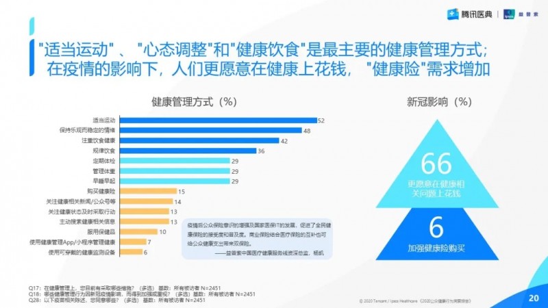 除了更积极地应对已发生的健康问题外,疫情也让公众更加意识到保持健康的重要性,"防范于未然"的意识得到了全面的提升。后疫情时代的公众健康管理方式呈现出从“被动治疗”到“主动预防”,“生理健康”和“心理健康”两手抓的趋势。在疫情的影响下,有66%的公众表示更愿意在健康上花钱了,疫情激发了公众对“健康险”的需求。益普索中国医疗健康服务线资深总监杨凯认为,疫情后公众保险意识的增强及国家医保IT的发展,促进了全民健康保险的接受度和普及度。商业保险结合医疗保险的互补也可给公众健康支出带来双保险。