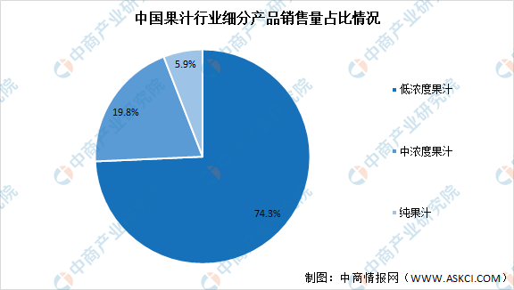 数据显示,从零售市场结构来看,低浓度果汁为市场消费主流,低浓度果饮料零售量占果汁饮料总零售量的74.3%,中浓度果饮料零售量占果汁饮料总零售量的19.8%,纯果汁零售量占果汁饮料总零售量的5.9%。